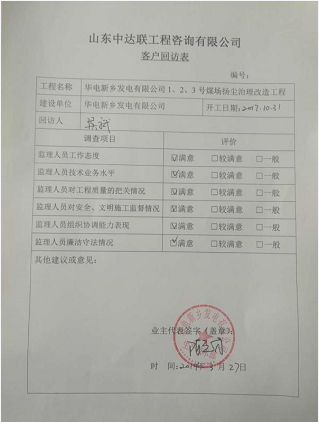 云南華電鎮(zhèn)雄電廠超低排放改造項(xiàng)目客戶回訪表