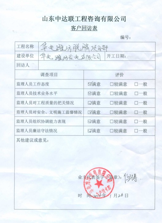 華電國際電力股份有限公司鄒縣發(fā)電廠回訪表