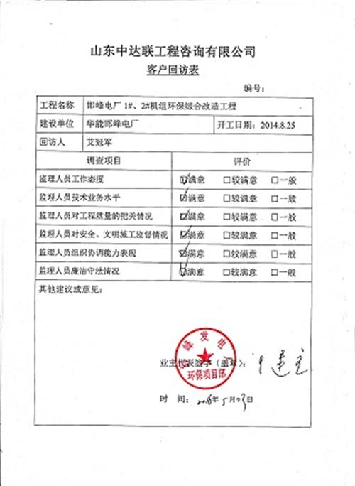 云南華電鎮(zhèn)雄電廠超低排放改造項(xiàng)目客戶回訪表