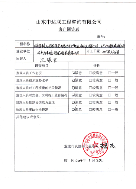 云南華電鎮(zhèn)雄電廠超低排放改造項目客戶回訪表